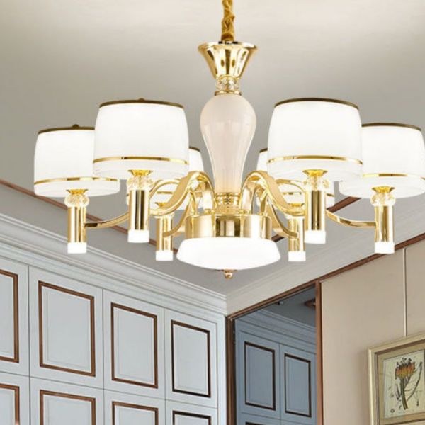 Luxe Transitional Gold Chandelier with Crystal Accents, Elegant Ceiling Fixture with White Shades - 110V-120V 7
