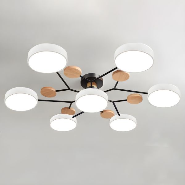 Scandinavian LED Flush Mount Ceiling Light, Geometric Sputnik Fixture with Solid Wood Accents, Low Profile Ambient Lighting - White 110V-120V 7