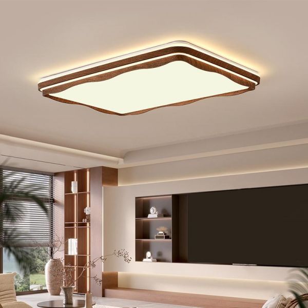 Mid-Century Walnut Finish Flush Mount LED Ceiling Light with Organic Wavy Rim - 110V-120V Rectangle