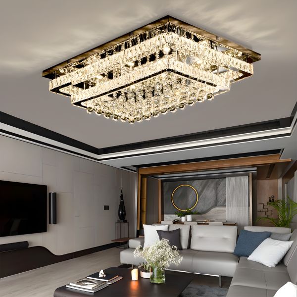 Luxe Crystal LED Flush Mount Ceiling Light, Geometric Faceted Chandelier with Polished Stainless Steel Finish and Adjustable Color Temperature - 110V-120V Rectangle
