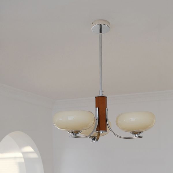 Mid-Century Wood and Chrome Chandelier, Multi-Light Ceiling Fixture with Glass Shades - 3 110V-120V Milky Yellow