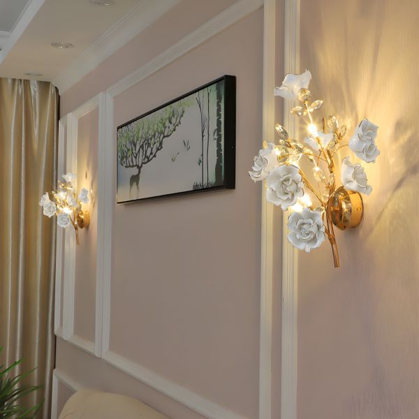 Romantic French Country Floral Wall Sconce, Gold Branch Vanity Light with Ceramic Roses and Crystal Accents - 110V-120V White 3