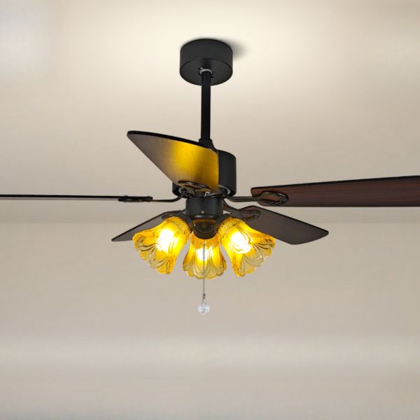 Chandelier with Ceiling Fan, LED/Incandescent/Fluorescent, Walnut Color, Solid Wood, 5 Blades, Adjustable Suspension Length for Residential Use, Casual Style, 3, 110V-120V, Flower