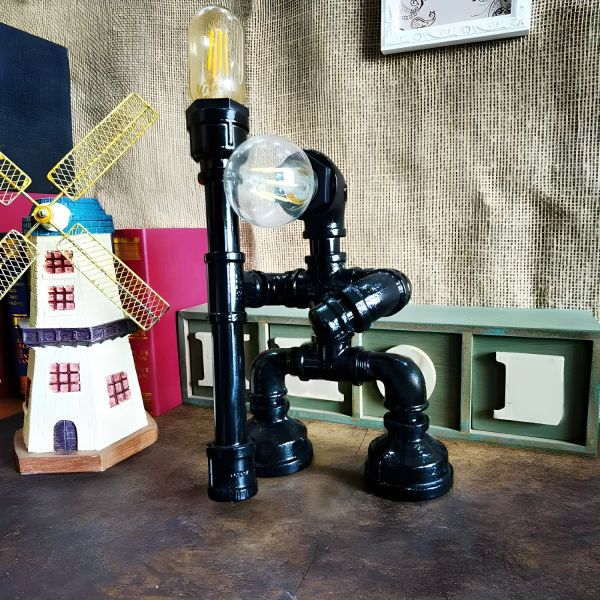 Steampunk Industrial Pipe Table Lamp, Retro Metal Robot Desk Light for Bedroom Living Room Decor - 110V-120V Black A