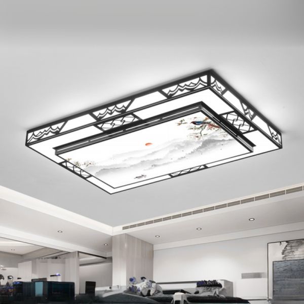 Zen-Inspired LED Flush Mount Ceiling Light, Ink Wash Landscape Art Diffuser with Black Metal Frame - 110V-120V Rectangle White Light 47.5"