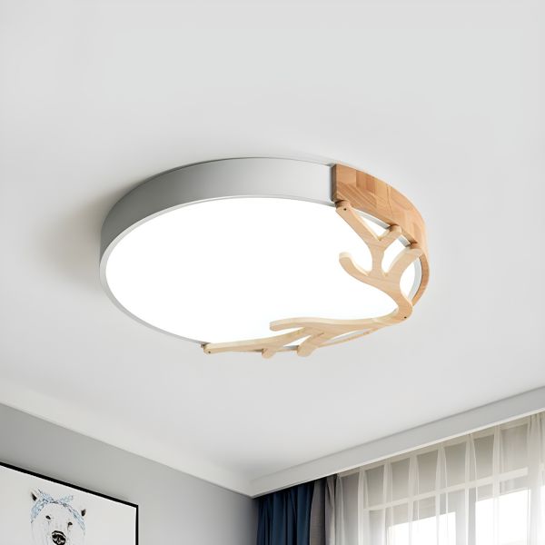 Scandinavian LED Flush Mount Ceiling Light with Wood Antler Accent for Nursery or Bedroom - White 110V-120V Small White Light