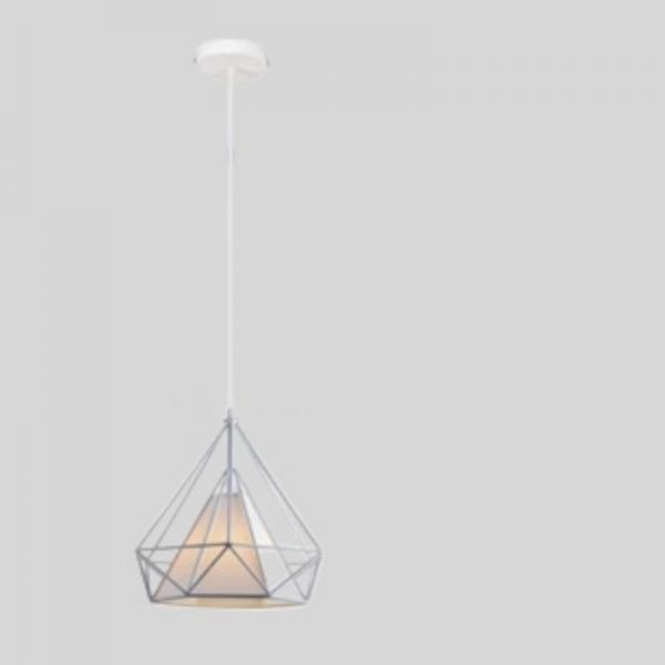 1-Head Diamond Cage Pendant Lamp Industrial Metallic Hanging Light Kit with Inner Conic Fabric Shade - 110V-120V White