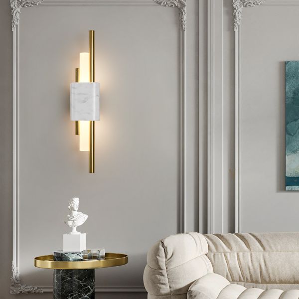 Mid-Century Luxe LED Wall Sconce, Linear Gold Vanity Light with Real Marble Accent & Frosted Shade - 110V-120V White 18" Warm Light