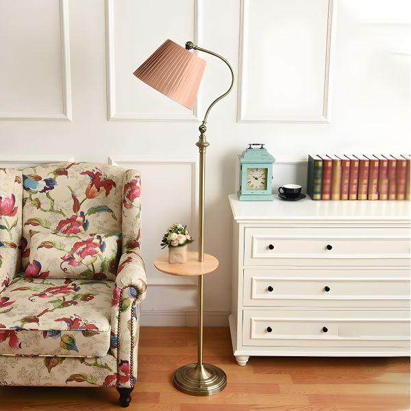Retro Arched Floor Lamp with Integrated Tray Table, Adjustable Reading Light with Pleated Shade - Fabric 110V-120V