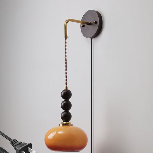 Mid-Century Modern Wall Sconce Light, Retro Glass Shade with Wood Bead Accents for Bedroom Hallway - 110V-120V 7" Caramel Rocker