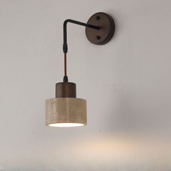 Japandi Travertine Drop Wall Sconce, Organic Stone & Wood Fixture for Ambient Bedroom Lighting - Cylinder 110V-120V Brown