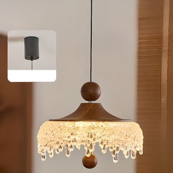 Mid-Century Walnut Finish Pendant Light with Textured Water Drop Glass Shade - 1 110V-120V