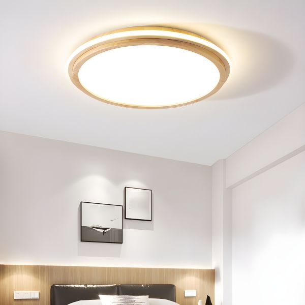 Scandinavian Round Flush Mount Ceiling Light, Natural Wood LED Fixture - 110V-120V 12.5" White Light