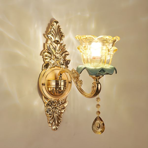 French Baroque Gold Wall Sconce, Vintage Floral Glass Shade with Crystal Accents, Ornate Fixture for Hallway or Bedroom - 110V-120V Gold 1 A