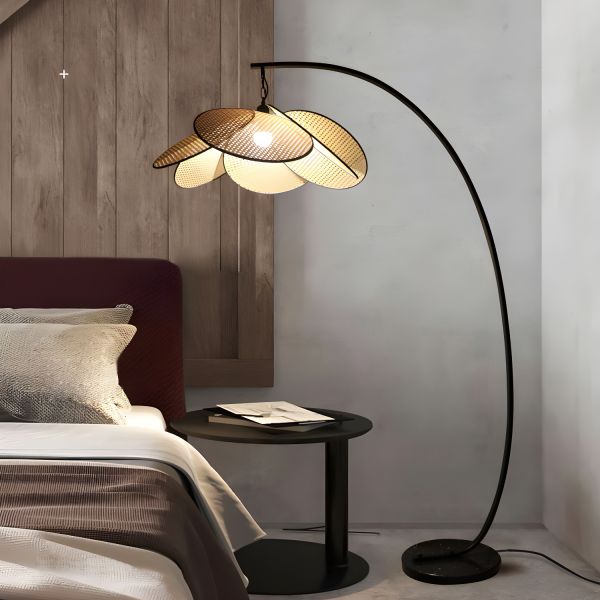 Bohemian Arched Floor Lamp with Woven Rattan Shade and Solid Marble Base - 110V-120V Beige