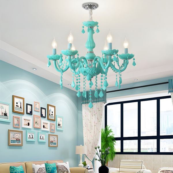 French Country Turquoise Candle Chandelier with Draped Crystal Accents - 110V-120V 6