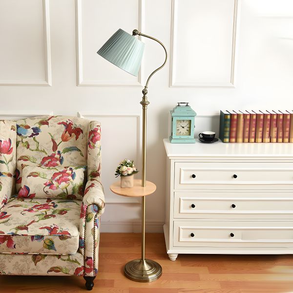 Vintage Floor Lamp with Built-in Wood Tray Table, Adjustable Brass Standing Light with Pleated Shade - 110V-120V Green