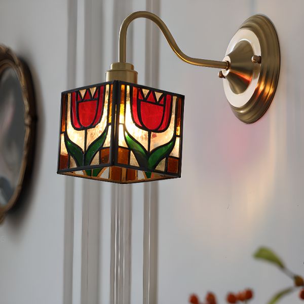 Vintage Geometric Stained Glass Wall Sconce, Brass Finish Metal Fixture with Cube Shade - Red 110V-120V 8"