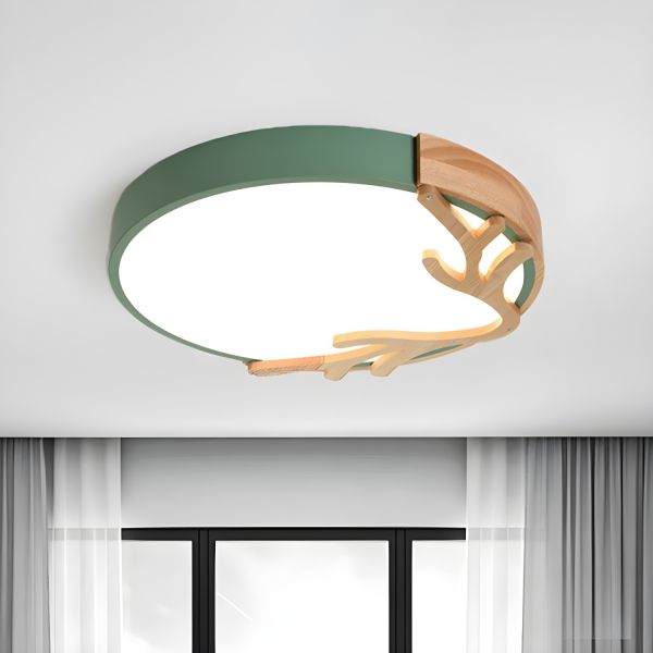 Scandinavian LED Flush Mount Ceiling Light with Wood Antler Accent for Nursery or Bedroom - Green 110V-120V Small White Light