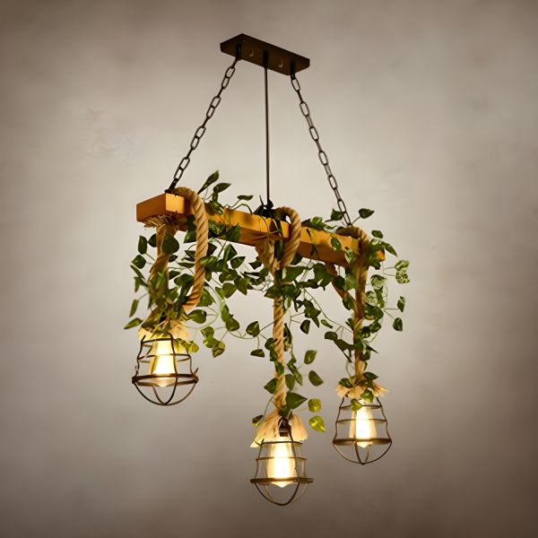 Rustic Farmhouse Linear Island Chandelier, Solid Wood Beam & Hemp Rope Pendant Light with Industrial Wire Cages - 110V-120V Green 3