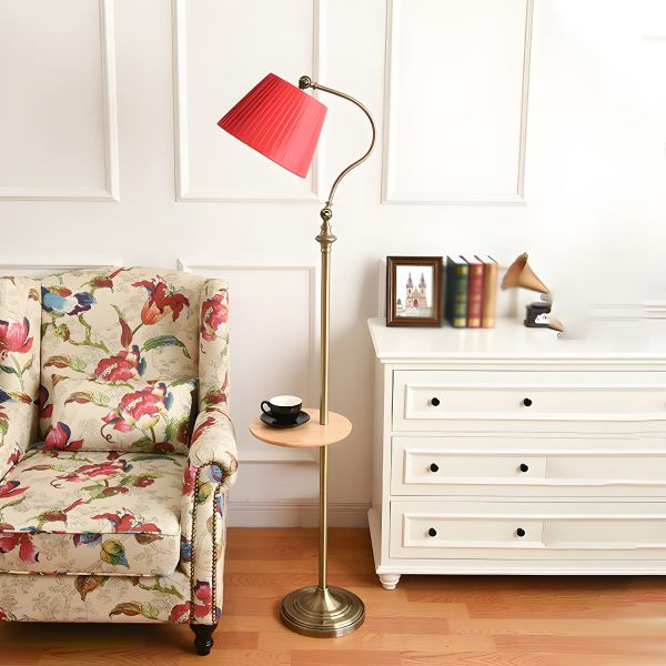 Vintage Floor Lamp with Built-in Wood Tray Table, Adjustable Brass Standing Light with Pleated Shade - 110V-120V Red