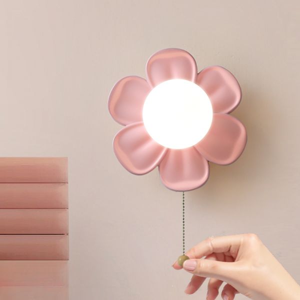 Whimsical Flower Wall Sconce with Pull Chain, Danish Pastel Resin Bedside Lamp for Nursery Bedroom - Pink 110V-120V