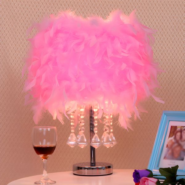 Glam Feather Table Lamp with Crystal Accents for Soft Bedroom Ambiance - 110V-120V Pink