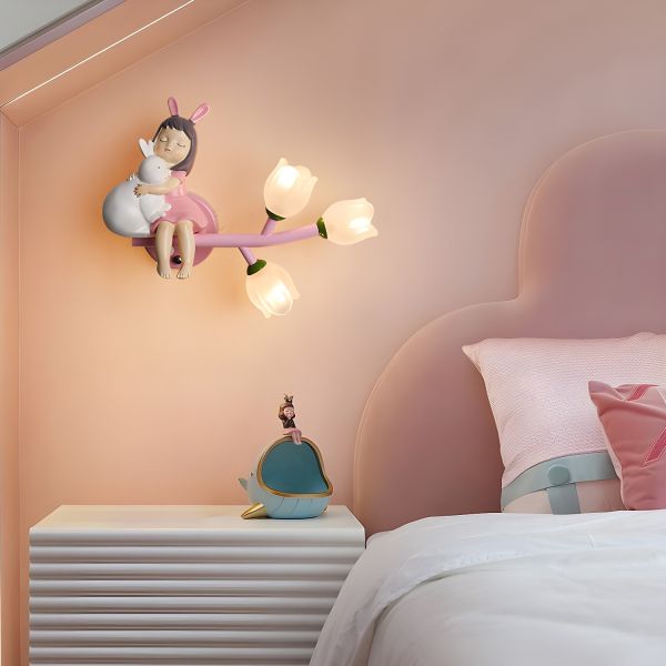Whimsical Scandi Nursery Wall Sconce, 3-Light Flower Branch Fixture with Resin Character, Decorative Kids Room Lamp - 110V-120V Pink Rabbit