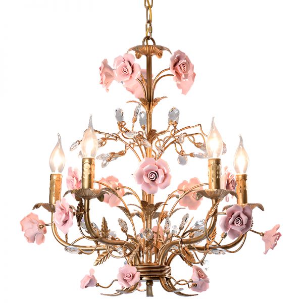 French Country Floral Chandelier with Sculpted Ceramic Roses, Crystal Accents, and Antique Gold Finish - 5 Pink 110V-120V