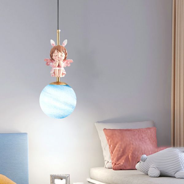 Whimsical Nordic Kids Wall Sconce, Resin Character Pendant with 3D Moon Shade for Nursery Decor - 110V-120V Pink Planet