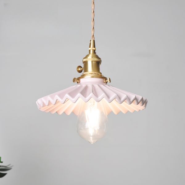Vintage Pleated Pendant Light, Solid Brass Hanging Lamp with Rotary Switch for Kitchen Island - 1 Pink 110V-120V