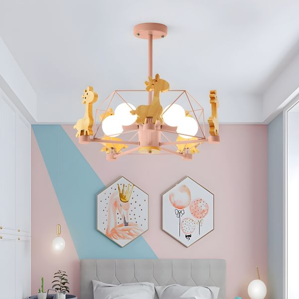 Nordic Kids Ceiling Light, 5-Light Nursery Chandelier with Wooden Giraffe Figures - 110V-120V Pink
