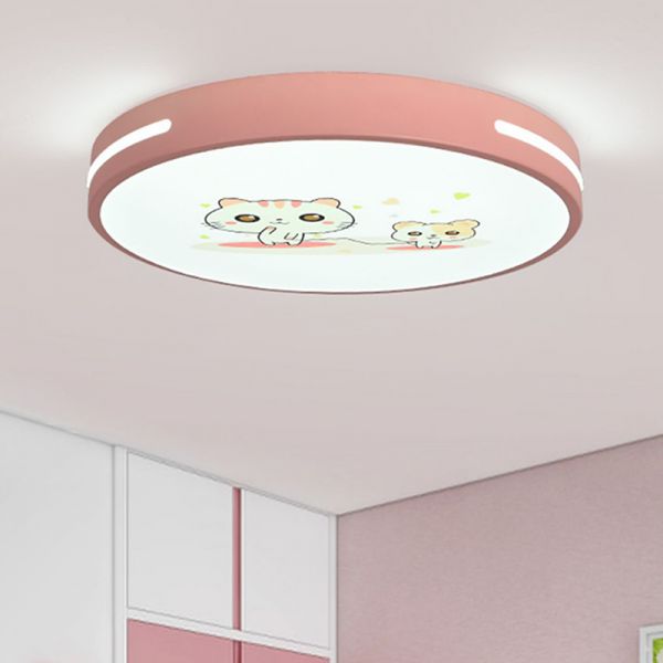 Whimsical Cartoon Cat Flush Mount Ceiling Light, Round Acrylic LED Fixture for Kids Bedroom Nursery - Pink 110V-120V 16"