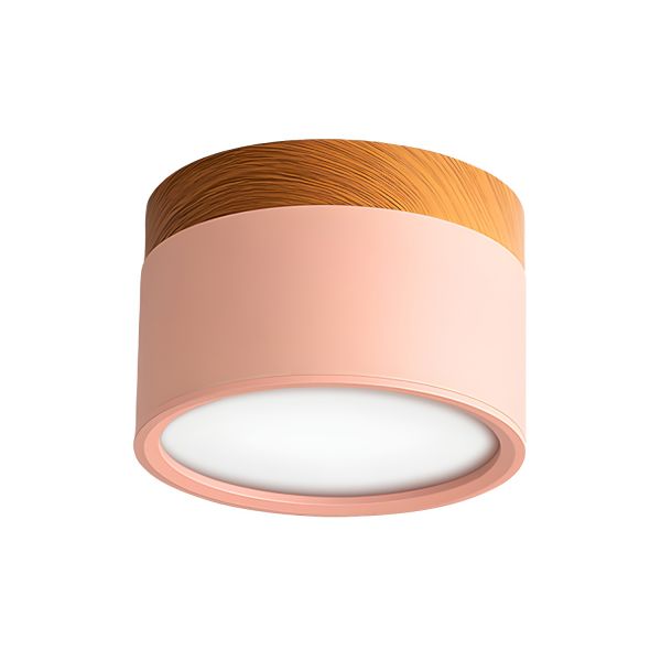 Scandinavian LED Flush Mount Ceiling Light, Round Cylinder Surface Downlight with Wood Accent - 110V-120V White Light Pink