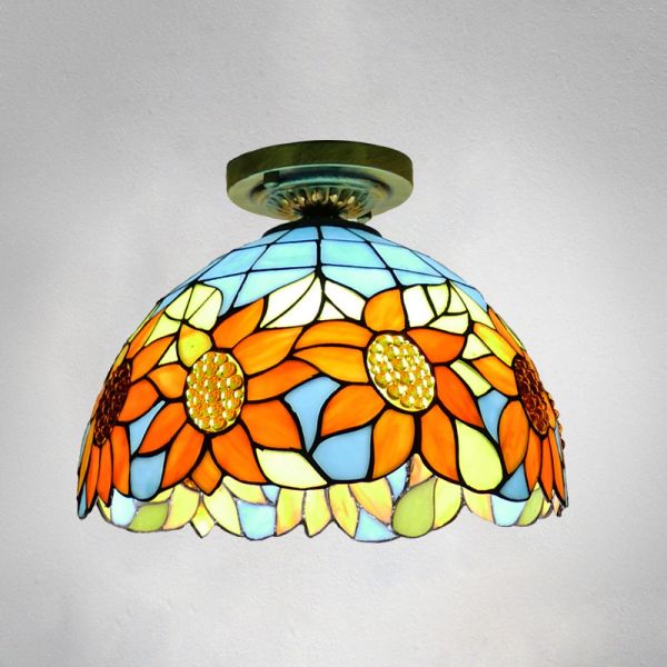 1-Light Metal Dome Flush Mount Light, Colorful Shade Tiffany Style Ceiling Mount - Orange/ Yellow 110V-120V