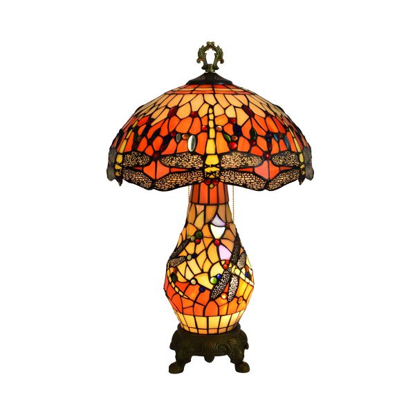 Vintage Tiffany Style Stained Glass Table Lamp with Dragonfly Design and Double Lit Nightlight Base - 110V-120V Orange