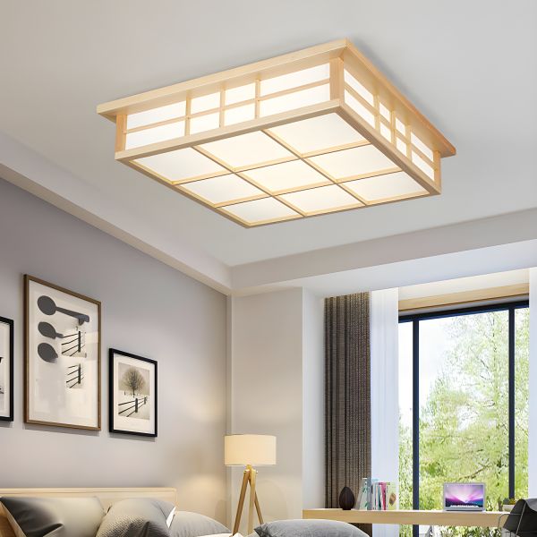 Zen Minimalist Solid Pine Flush Mount Ceiling Light, Square LED Fixture with Shoji Grid Design - 110V-120V 14" Remote Control Stepless Dimming