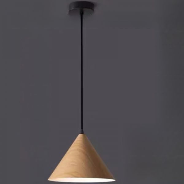 Cone Pendant Light with Wood-Toned Iron Shade, LED & Incandescent/Fluorescent, Direct Wired Electric with Enclosure for Residential Use, 110V-120V, 10"