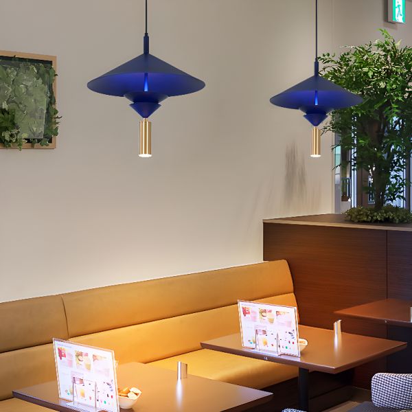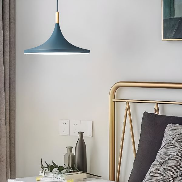 Scandinavian Minimalist Pendant Light Fixture with Wood Accent, Matte Metal Shade for Kitchen Island - Blue 110V-120V Cone