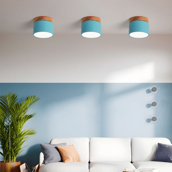 Scandinavian Round Ceiling Light, 4-Inch Mini Flush Mount Fixture with Wood Accent for Hallway - 110V-120V Blue