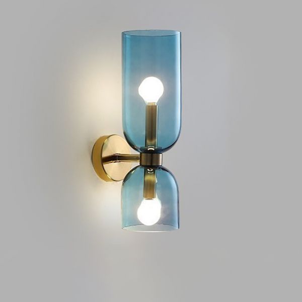 Mid-Century 2-Light Wall Sconce, Brushed Brass Fixture with Hourglass Glass Shade for Vanity or Hallway - 110V-120V Blue