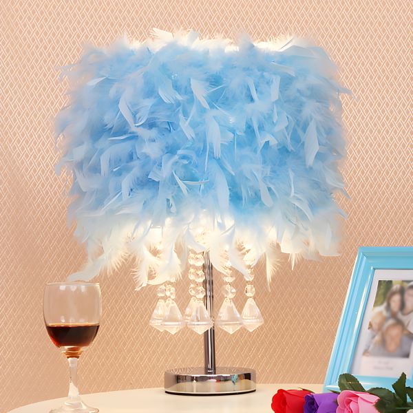 Glam Feather Table Lamp with Crystal Accents for Soft Bedroom Ambiance - 110V-120V Sky Blue