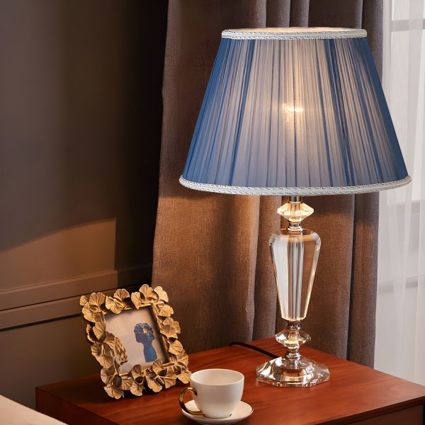 Elegant K9 Crystal Table Lamp with Pleated Fabric Shade and Faceted Body - 110V-120V Blue