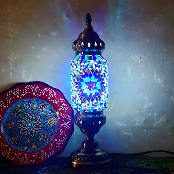 Bohemian Moroccan Mosaic Cylinder Table Lamp, Antique Bronze Finish - 110V-120V Royal Blue/White