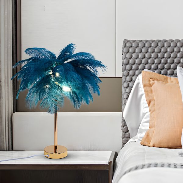 Luxe Art Deco Feather Lamp with Gold Metal Base and Soft Ambient LED Glow - 110V-120V Blackish Green