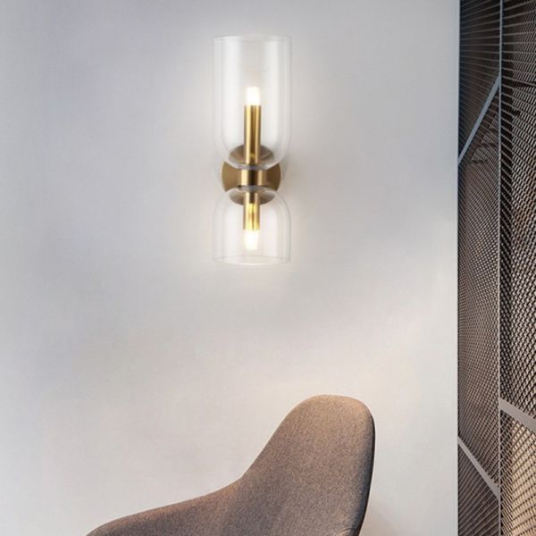 Mid-Century 2-Light Wall Sconce, Brushed Brass Fixture with Hourglass Glass Shade for Vanity or Hallway - 110V-120V Clear