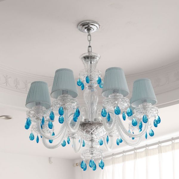 Elegant French Country Chandelier with Pleated Blue Shades and Crystal Teardrops - 110V-120V 25.5"