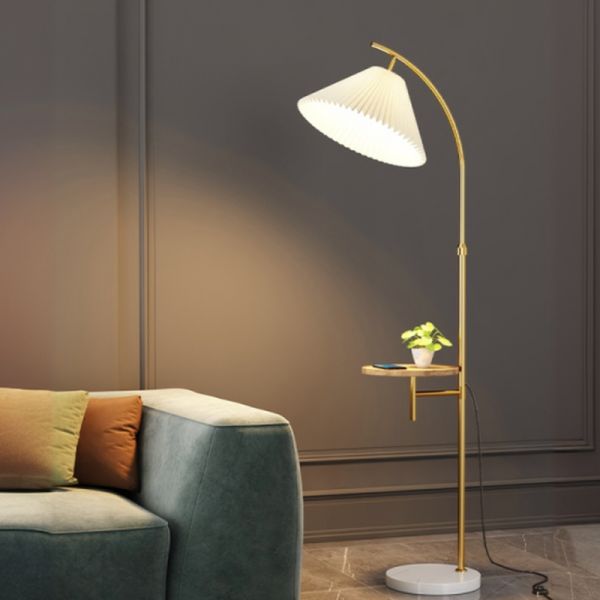Mid-Century Arched Floor Lamp with Integrated Tray Table & Pleated Shade - Gold Wood 110V-120V