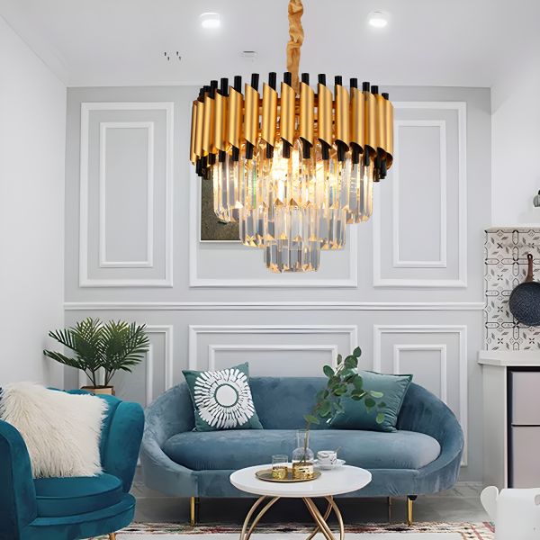 Luxe Art Deco Crystal Chandelier, Gold Tiered Drum Pendant Light Fixture for Dining Room Foyer - 110V-120V