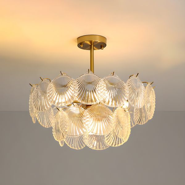 Art Deco Scallop Glass Chandelier, Gold Semi Flush Mount Ceiling Light for Dining Room - Small 2 Tiers Clear Glass 110V-120V